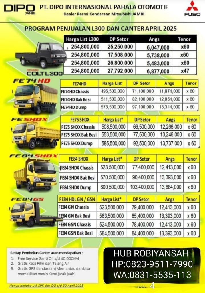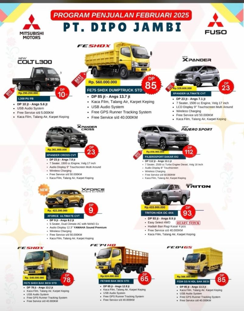 Saya Sales yang berpengalaman di produk Mitsubishi selalu akan memberikan penawaran dan pelayanan terbaik untuk para customer untuk pembelian unit mobil atau truk Mitsubishi di Mitsubishi Jambi.